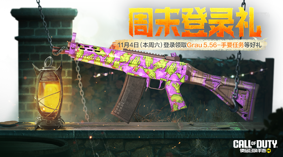 11月1日,周末登录礼惊喜来袭,战士们前往游戏预约,并于11月4日登录游戏,就能获得稀有级武器:Grau 5.56-手要任务等好礼。