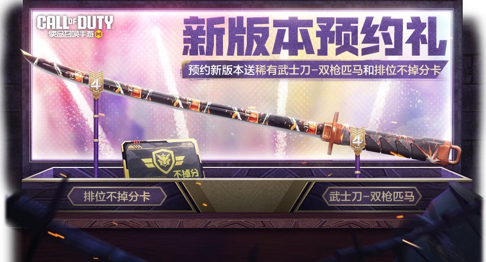 新版本即将上线,又会带来哪些新内容呢?11月4日,新版本预约礼如期而至,战士们参与预约即可获得排位不掉分卡、稀有级武士刀-双枪匹马!