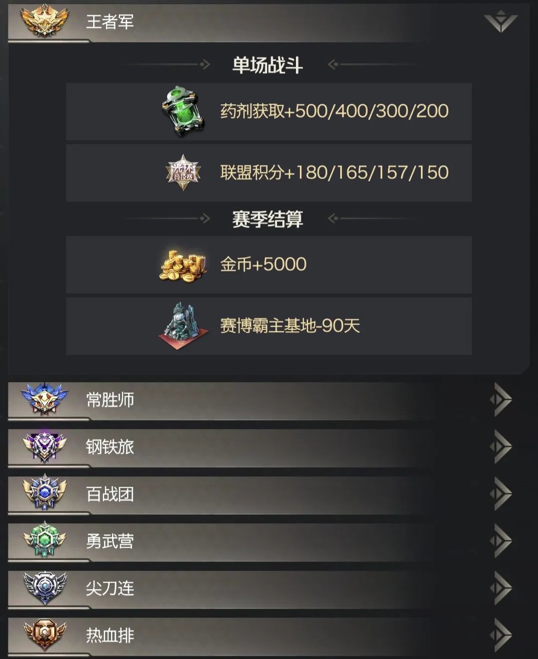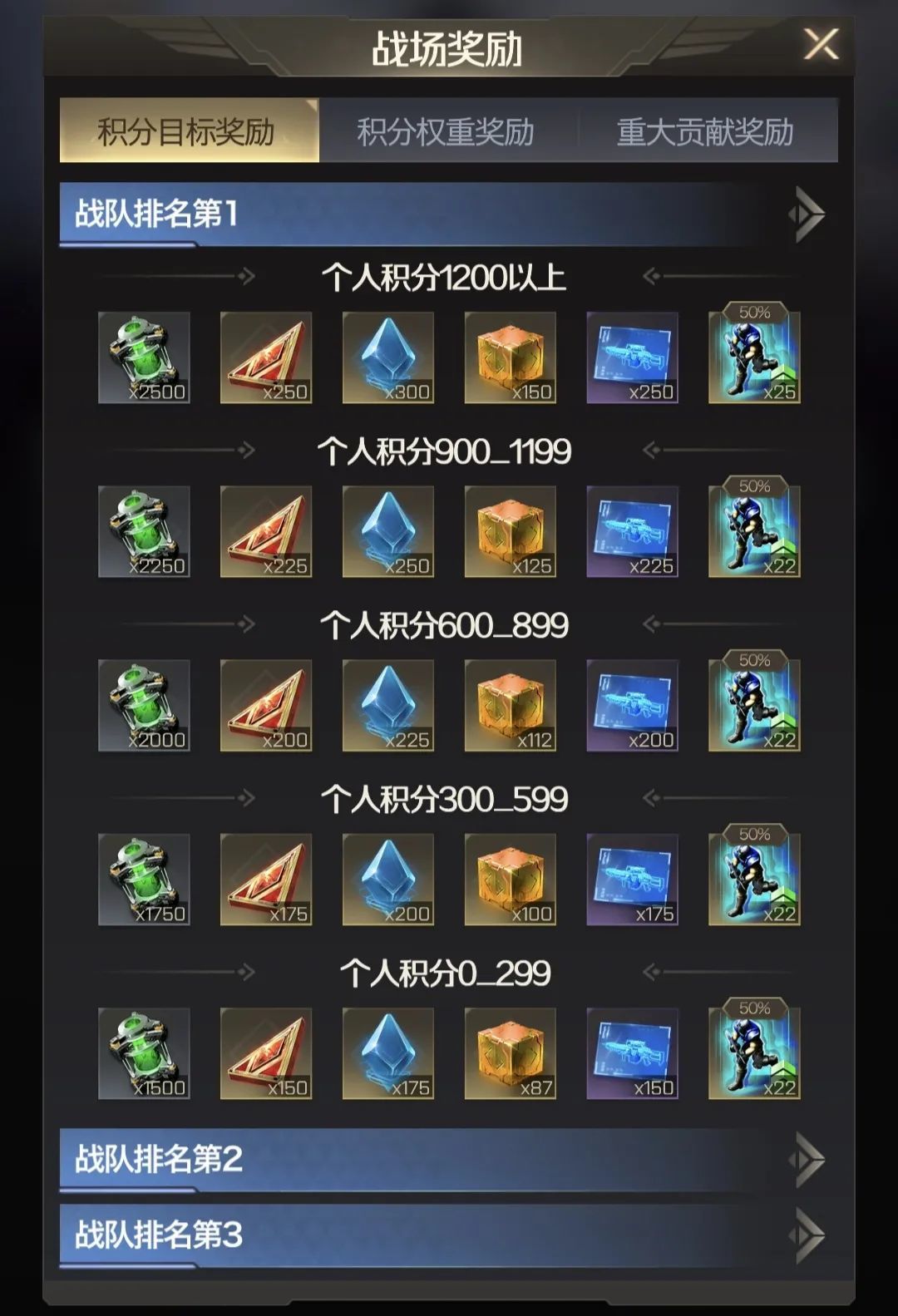 赛季开始后,每一期都会对报名的战队进行排序,根据全服战力排名会有初始星级奖励,战队排行里可以看到战斗力、积分以及段位排行,各位指挥官通过历史战绩里可以查看战队详细情况,积分的变化以及段位的变化。此外,赛博光环赛季战场奖励大幅提升,积分目标达到对应的个人积分,可获得大量的赛博能量药剂以及量子扩充石、泰晶等稀有道具奖励,积分权重奖励与重大贡献奖励也都有大幅提升。