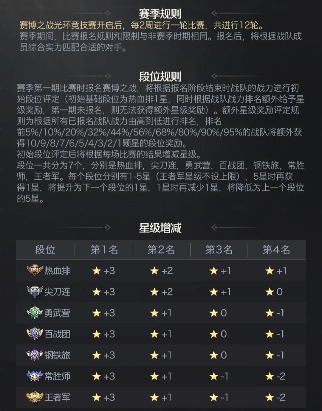 报名阶段结束时,会对战队的战力进行初始段位评定,段位共分为7个,分别是热血排、尖刀连、勇武营、百战团、钢铁旅、常胜师和王者军。初始段位评定后,根据每场比赛的结果增减每个段位的星级, 具体奖励规则如下: