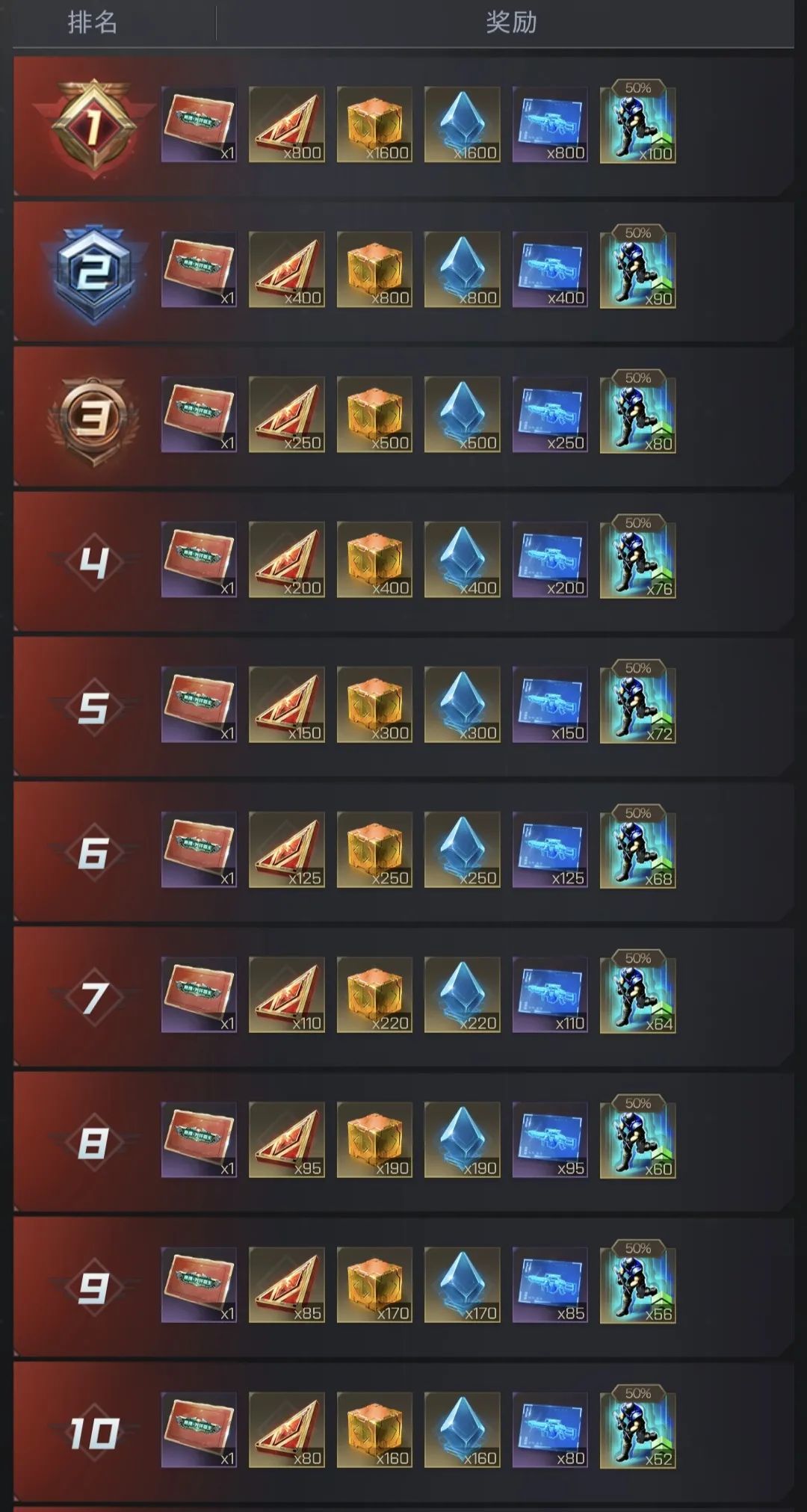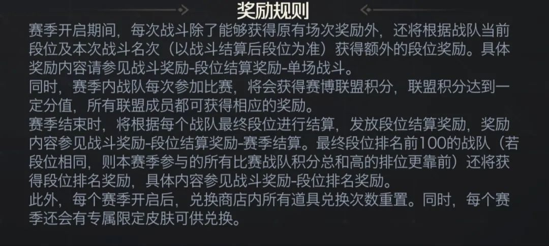 结算奖励分为单场战斗奖励和赛季结算奖励,每场比赛根据段位以及比赛名次的不同,发放不同的奖励。