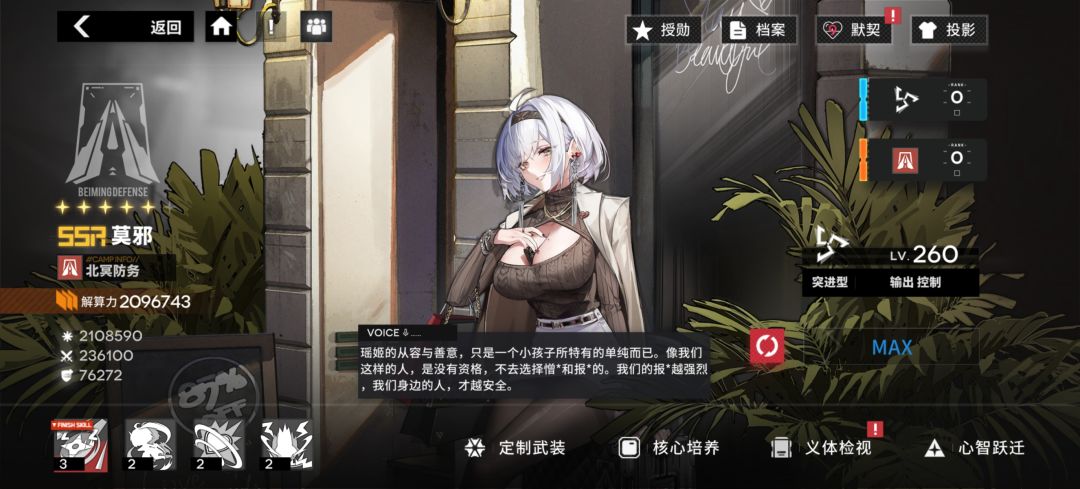 平民三幻神之一。在被动恐怖增伤的加持下,莫邪的输出能力极为亮眼。配合闪现切后排的技能。且由于技能原因很少出现在前排,因此相比于其它输出输出环境更好,生存能力更强。可以有效针对对面启动比较慢的C位。高星当主c低星当副c,本身还带控制,一只有练度的莫邪可以把对面后排全带走,堪称平民战神。核心推荐贪狼,义体推荐黑天鹅四件套,主打一个闪现到后排收割(仅个人理解)。