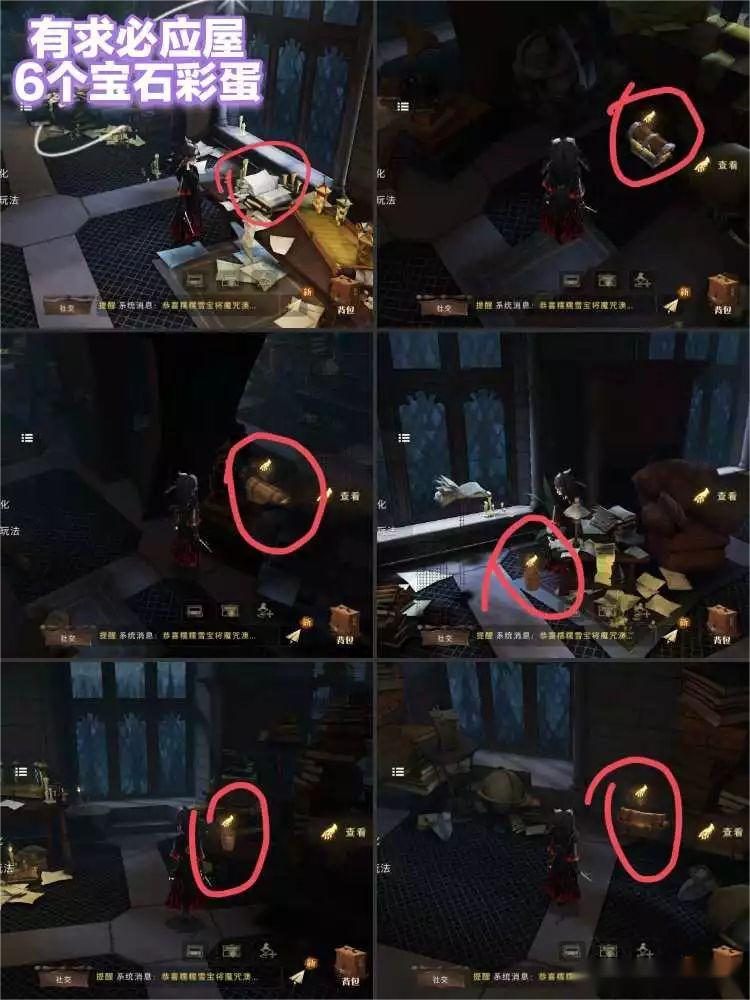 有求必应屋有六个宝石彩蛋,有点不知道怎么形容具体位置,但是很好找的,转一圈几乎就找到六个了,找不到的可以看图中彩蛋周围的摆设去找一下。