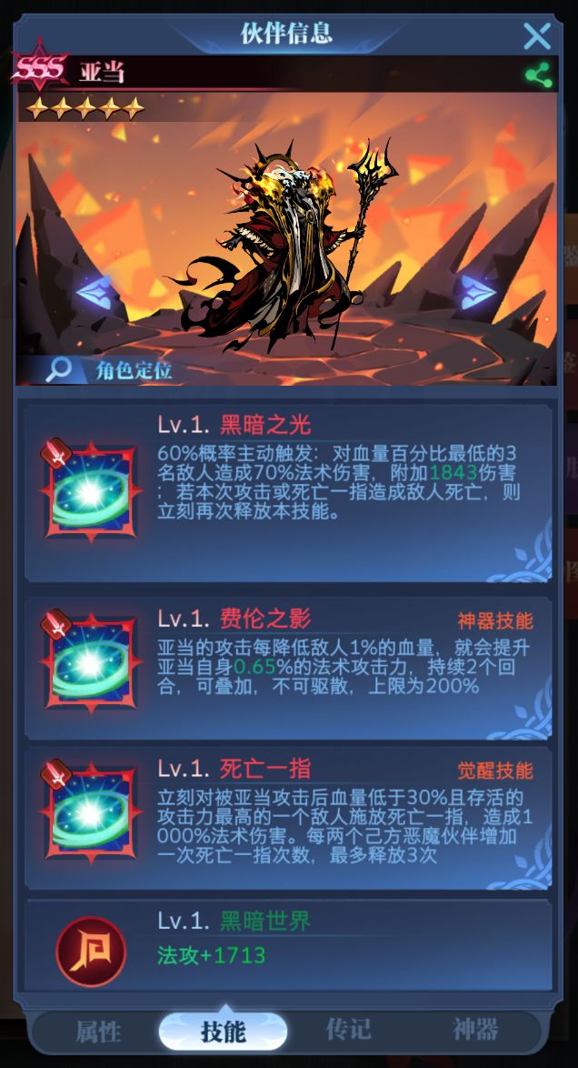 觉醒技能:死亡一指,立刻对被亚当攻击后血量低于30%且存活的攻击力最高的一个敌人施放死亡一指,造成1000%法术伤害。每两个己方恶魔伙伴增加—次死亡一指次数,最多释放3次