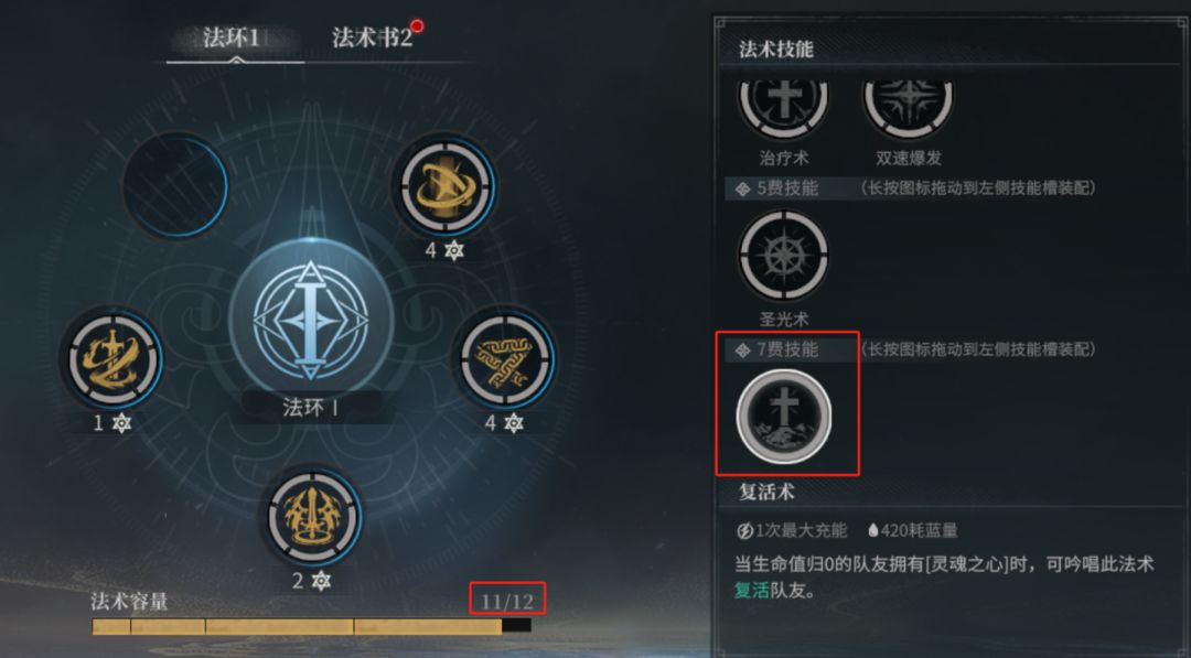 同样的,对于法术容量的提升也是很关键的一环,如下图牧师标志性的复活需要7个格子,但精神过低只能望技能长叹,但高精神能让你鱼和熊掌兼得。