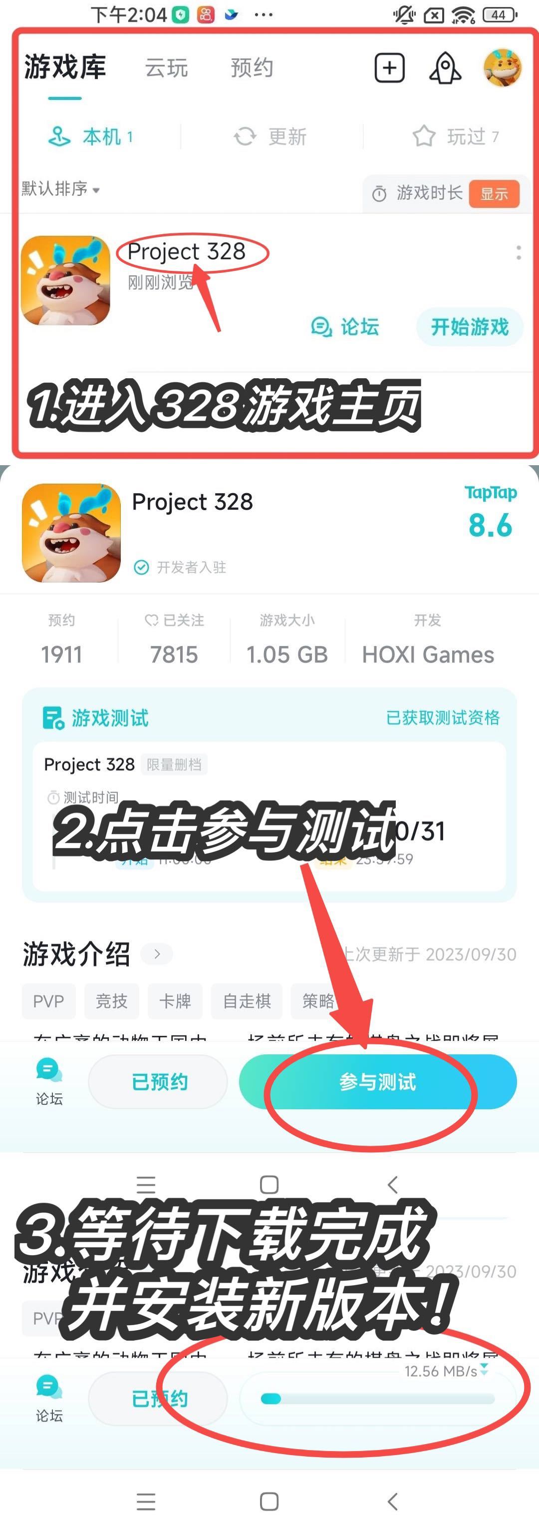 在taptap软件中点开右下角《我的游戏》按钮,在游戏库中选择Project328,进入328游戏主页,点击参与测试,之后等待下载完成并安装最新版本,若遇问题请联系客服QQ:3651132403。具体可参考下图: