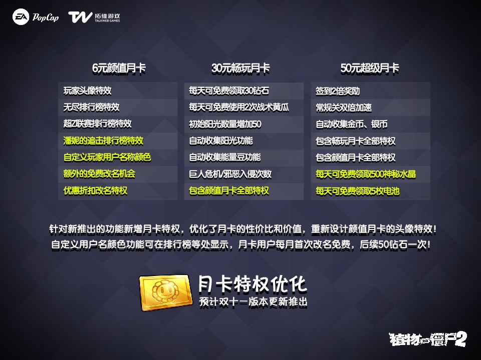 针对六元档月卡增加了大量特权,史诗级加强,多彩昵称、新的VIP特效、免费改名和优惠改名机会都来了!五十元档位超级月卡也新增了免费的神秘水晶和潘妮追击电池,敬请期待!