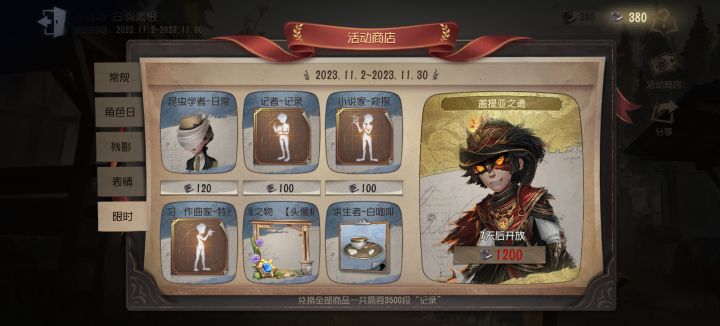 1,先说说近期皮肤排期,邮差今年会有第二件金皮,大副会有高级时装(金或紫),使徒高级时装(金或紫),感恩节返场:屠夫记录员金皮缔造者以及紫挂幸福之地,以及别的八款金皮。年底会出三丽鸥联动,两只随从以及两款,接着是守夜人,心理学家,古董商,雕刻家,以及昆虫学家的演绎之星紫皮,然后是渔女以及宿伞的宁芙奖金皮,噩梦金返场,最后就是期待的舞女年限皮肤(是可以用紫薯兑换的限定金噢)