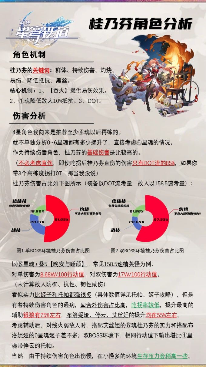 先叠个甲,说一下持续伤害的缺陷:不好打0T,伤害平滑导致小怪多时生存压力稍大在练度相同的情况下,仅看单核时的伤害,⑥魂桂乃芬+艾丝妲+银狼,伤害能够在火弱环境和0星魂姬子+布洛妮娅+银狼不分上下(但无火弱环境姬子强度直接下滑20%)。