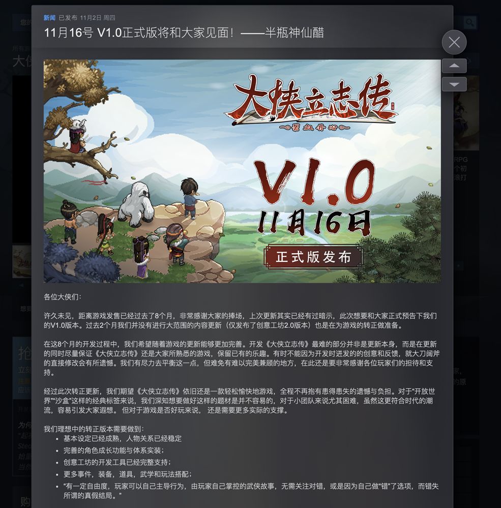 由“半瓶神仙醋”开发的《大侠立志传》将于11.16日迎来正式版