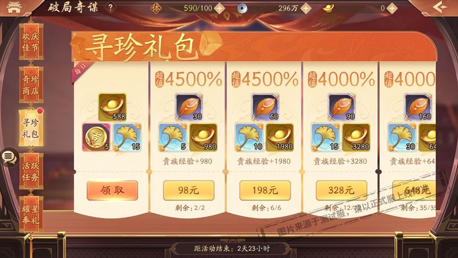 活动期间通过成长任务和充值礼包可获得限时抽奖道具“寻珍币”,可用于秘宝寻珍抽奖。