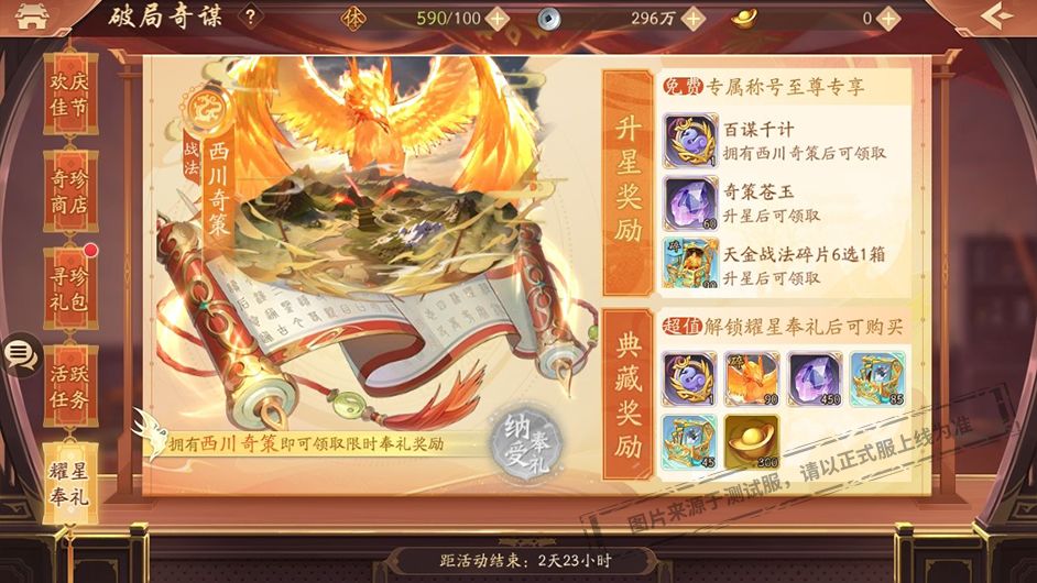 活动期间拥有西川奇策均可解锁并领取限时奉礼奖励,专属称号至尊专享。升星西川奇策将解锁更多奖励,切莫错过。