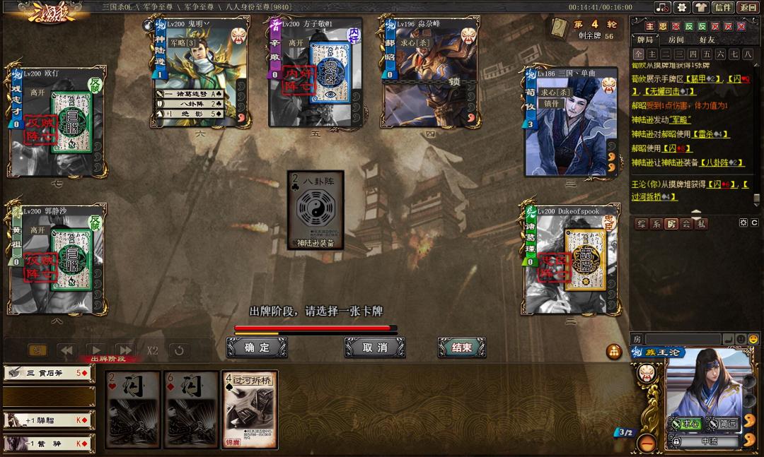 打击杀的时候发牌员不给力,没有一张输出牌,不过不慌,族王沦可以靠【简远】来重铸。拆荀攸,对神陆发动【求心】,触发【简远】重铸2闪来了1顺1南,顺荀攸,开南,收掉反贼郝昭摸上来一桃救回神陆,再杀荀攸用斧子强命。成功取得胜利。