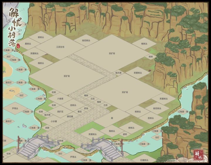 主题布局思路是富豪的矿场,一条蜿蜒小道直达,小道旁边设有矿场,富豪掌握着村落30%的财富。为了防止过度开发矿场资源而导致的环境破坏,于是伟大的村长大人我