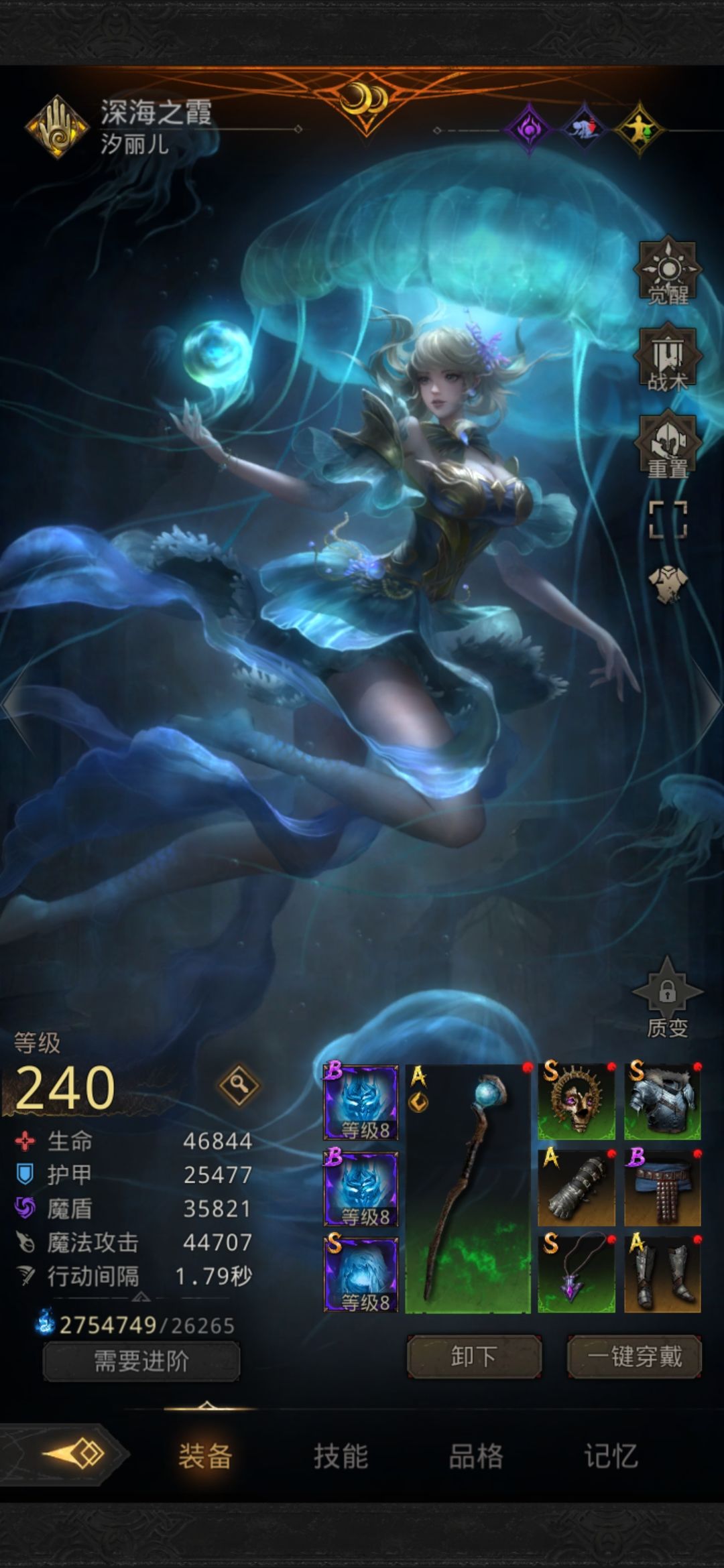 深海之霞也是求增伤以及暴击(没有暴击剑惹的祸!!!!),我带的是推图得的一把真伤杖,打了300万伤,聊济于无吧。符文牺牲