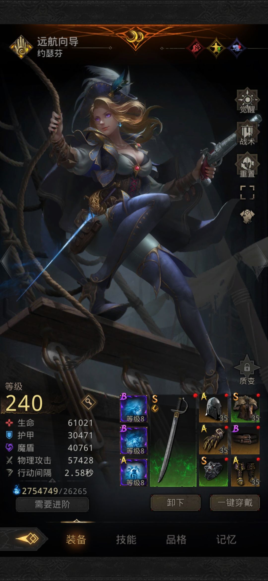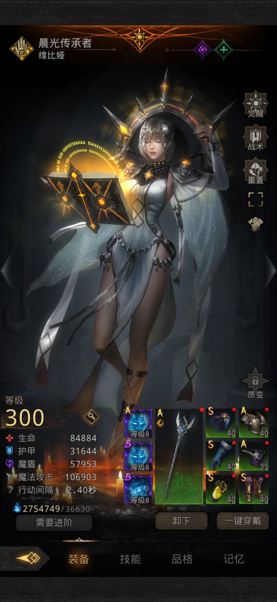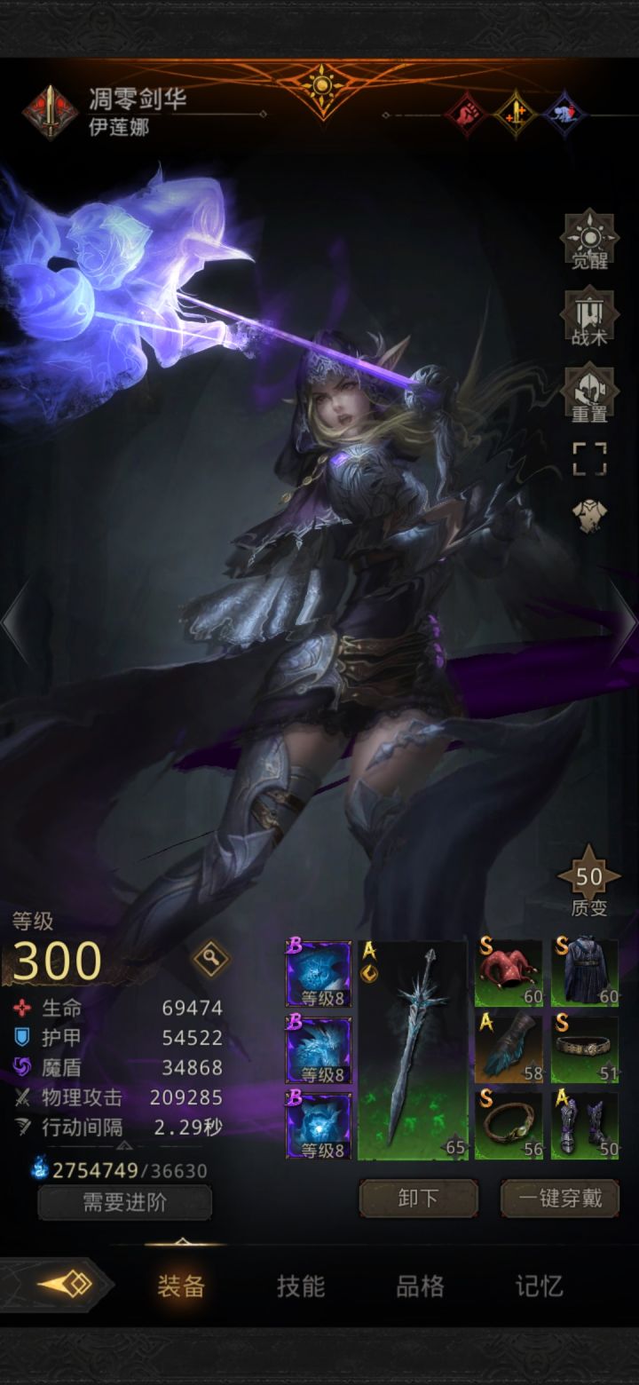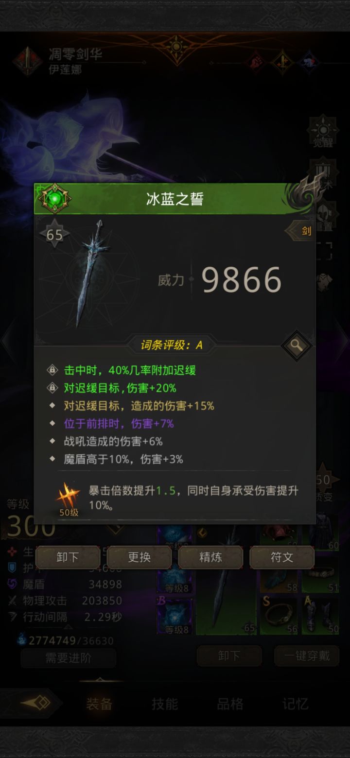 主c凋零剑华,用钥匙给她转一下(保证基础属性,因为没有暴击剑),然后上的其他装备只要加护甲就行,首饰给了减行动间隔的永恒之戒,还是没有暴击剑惹的祸。没有暴击剑所以给了冰蓝之誓,符文带了满级狂热(没办法,伺机伤害差了点)。