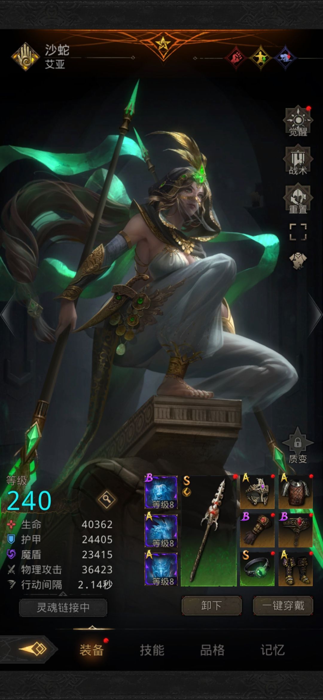 沙蛇主要求的是觥筹交错的减伤和回护甲,带绿色利维坦谷矛。符文刃甲