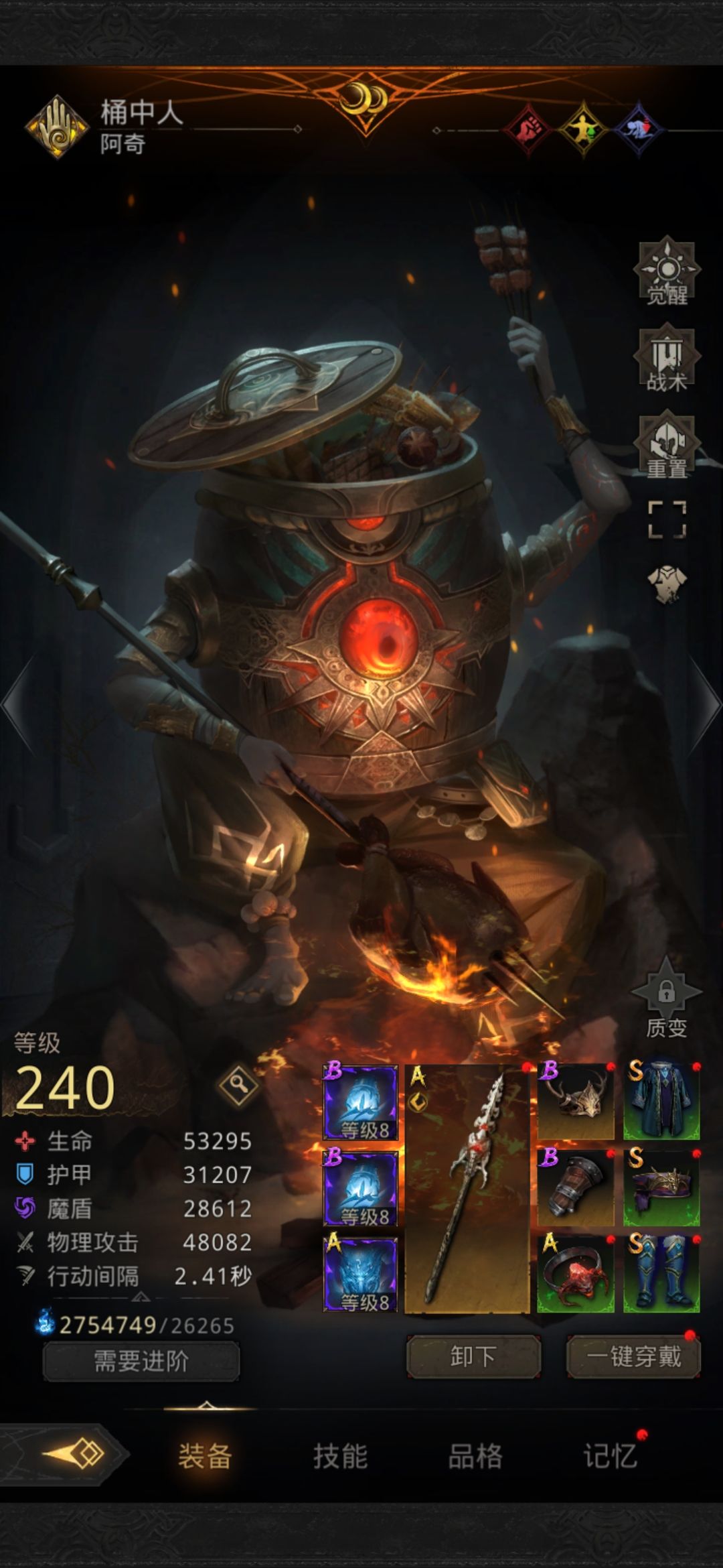 然后是桶中人,这个比较重要,战术只开加真伤的爆爆果和加盾的治愈果(这两个对于生存和伤害都挺好),我带的是金色利维坦骨矛。符文救赎
