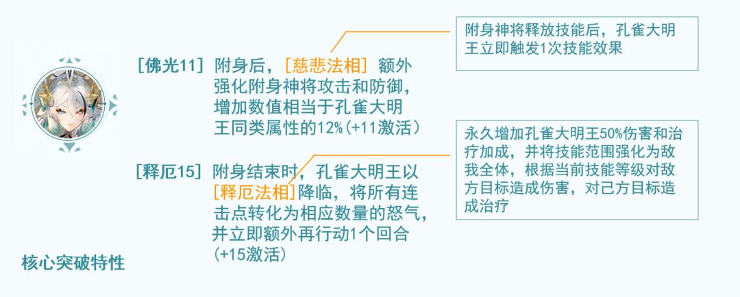 孔雀大明王最重要的三个能力是连携技能、突破+11和+15效果、法宝+25的特性,以下针对具体的特性描述,分别给出其在实战中的意义。