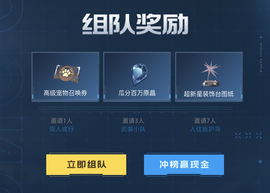一个人当显眼包怎么够?当然要组团当显眼包啦~抢注昵称成功后就可以点击【立即组队】按钮邀请好友组队啦,成功邀请未预约的好友组队来到未来世界,即可得珍品载具,还有机会冲榜赢现金!