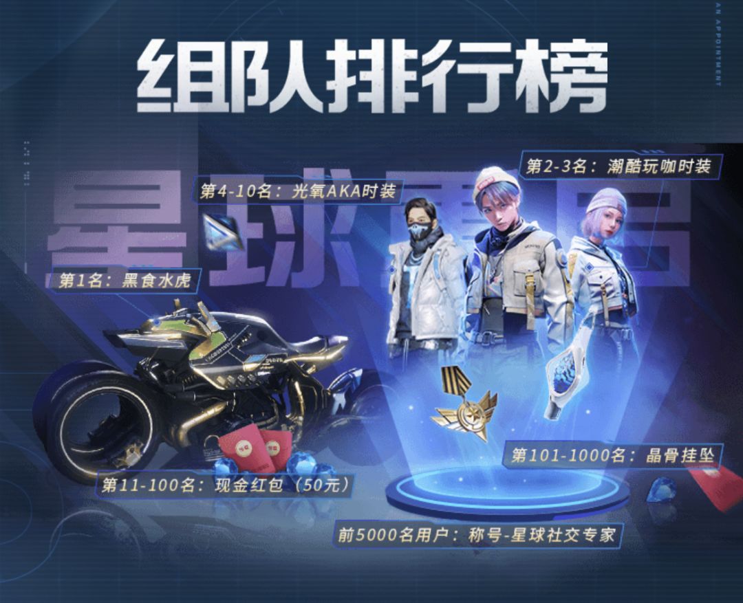 排行榜前100名人人有现金红包,前4-10名光氧AKA时装收入囊中,前2-3名潮酷玩咖时装身上穿,排行榜第1名的社交大佬,将获得黑食水虎珍品载具,骑上它更拉风,搭讪social都拿下!