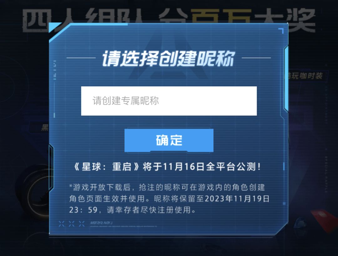 预约成功之后,大家即可输入自己想要的昵称,进行提前抢注。游戏开放下载后,抢注的昵称可在游戏内角色创建页面生效并使用。阿姨要划重点了!记住,抢注的昵称在游戏开服后将保留至11月19日23:59,幸存者们一定要记得及时注册使用哦~