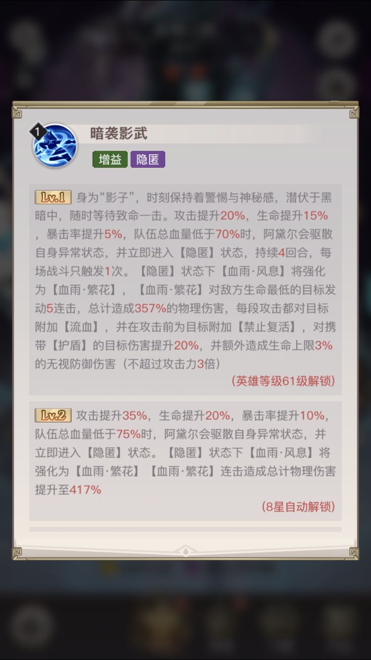 看图。当队伍总体血量到达一定值的时候,自身就会进入隐身效果,只要对面还在,只要没有反击类英雄那么就不会被打到。AOE群伤都打不到的BUG生存能力。并且隐身后自带灭杀跟高爆发单人伤害,谁说阿黛尔爆发不够呢?这么完美的英雄真的是推荐大家玩。