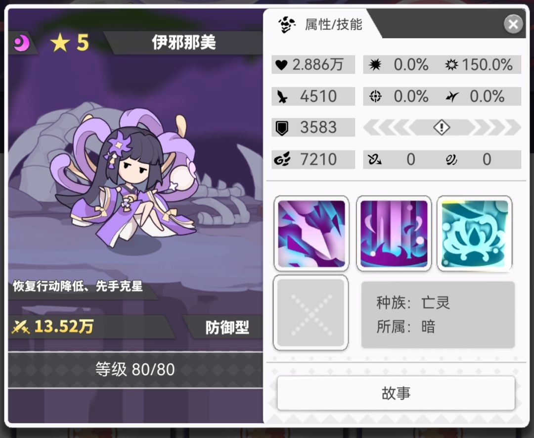 总结: 1/2技能中规中矩,强度还行,但⭐高才能有伤害,而3技能单单一个全体加两回合50%爆伤,就足以脱掉冷板凳的束缚,成为铁板钉钉的小挂件。