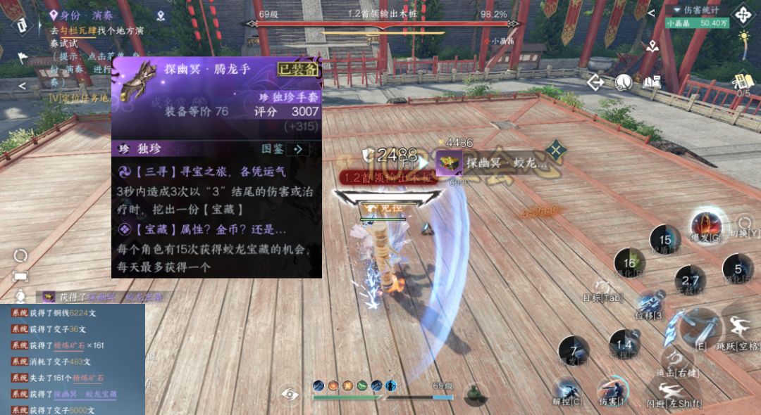 佩戴探幽冥·腾龙手,三秒内造成三次以三结尾的伤害或治疗,都可以挖出一份宝藏,,每个角色有15次机会,每天最多一次,奖励目前已知有,5000交子,100绑玉,300绑玉,其他的还没测试出来。