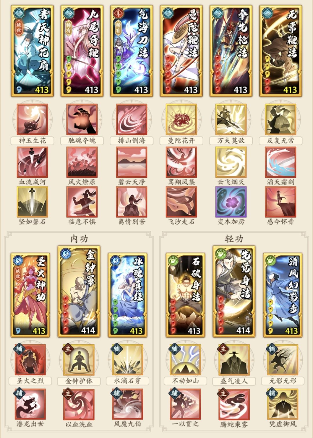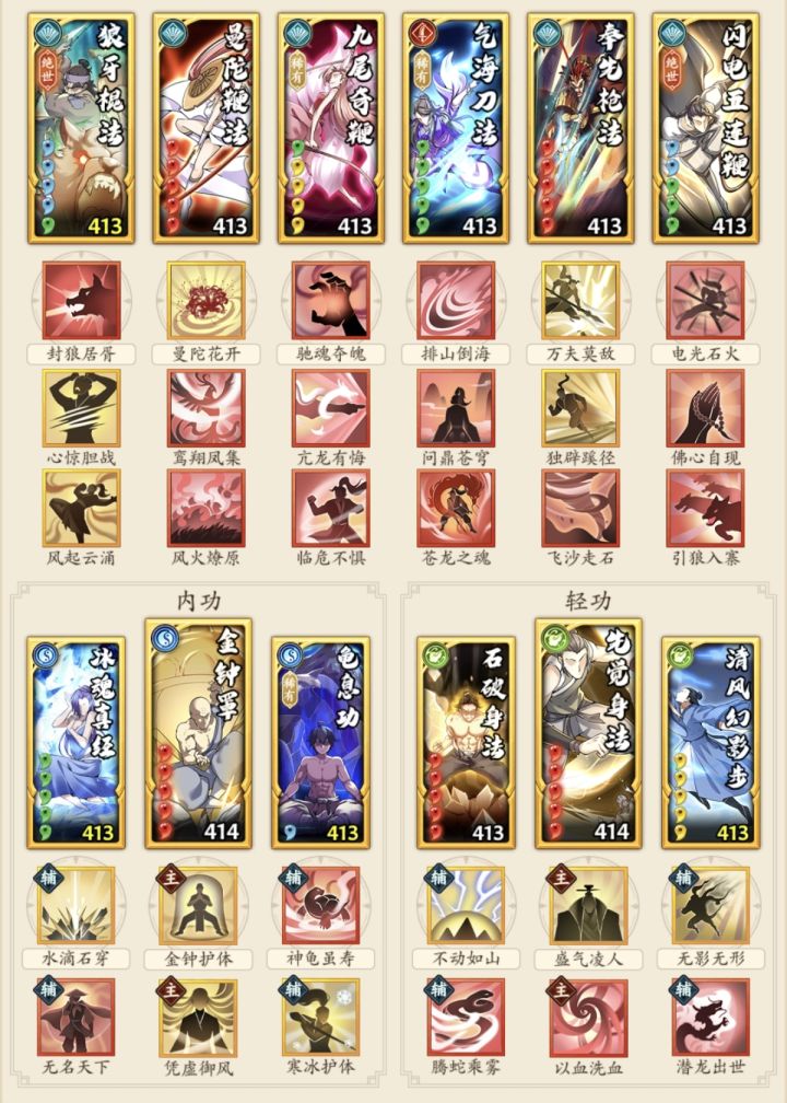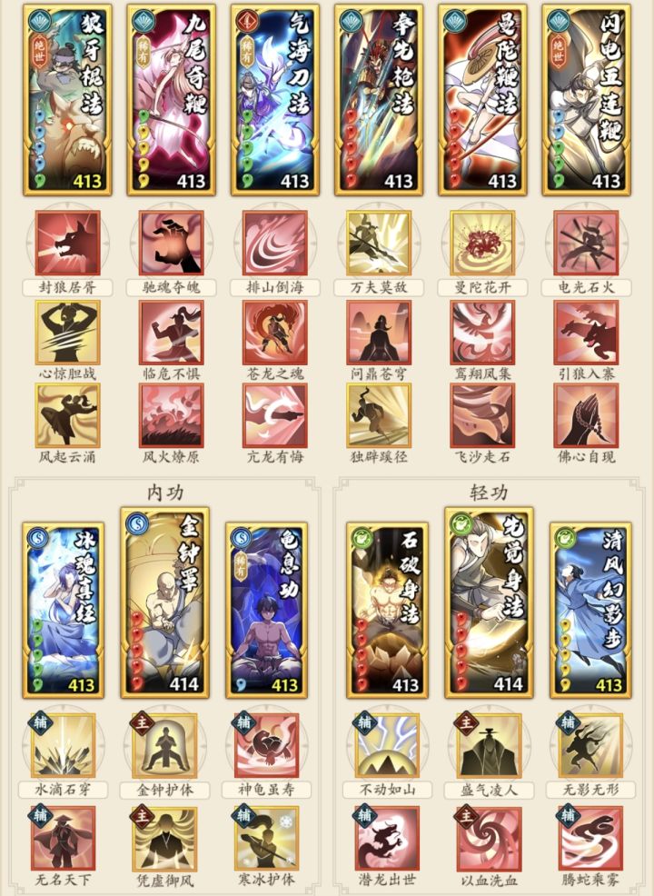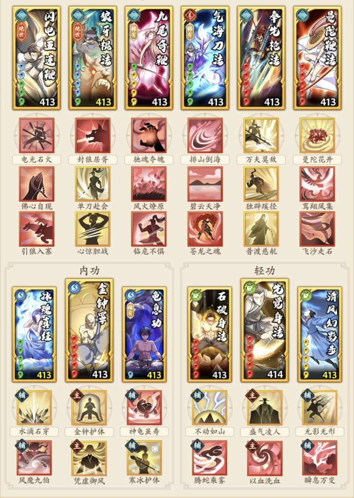 铜人前龟息功跟逍遥心法任选其一,铜人后混伤必带龟息。洗全功力冰魄就换蓁兰或者圣火,无名天下可用三步招风或如鱼替换