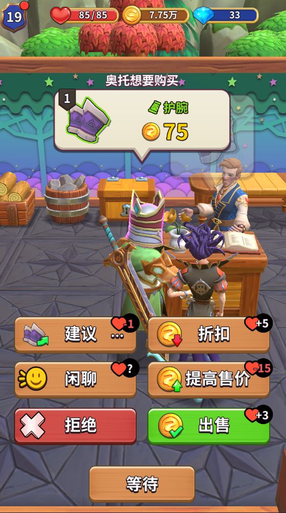 在《打造与冒险》这款游戏中,我们还可以和顾客形成互动,在游戏界面中点击顾客,开启与顾客的交易界面,在交易界面中可以建议顾客更换购买的商品,与顾客闲聊,将商品打折出售给顾客,提升顾客购买商品的价格。具体各项功能如下: