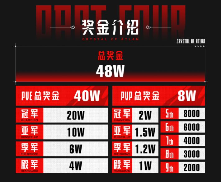 所有进入总决赛阶段的冒险者们,将瓜分48w总奖金,其中PVP赛道总奖金为8w,PVE赛道总奖金为40w。