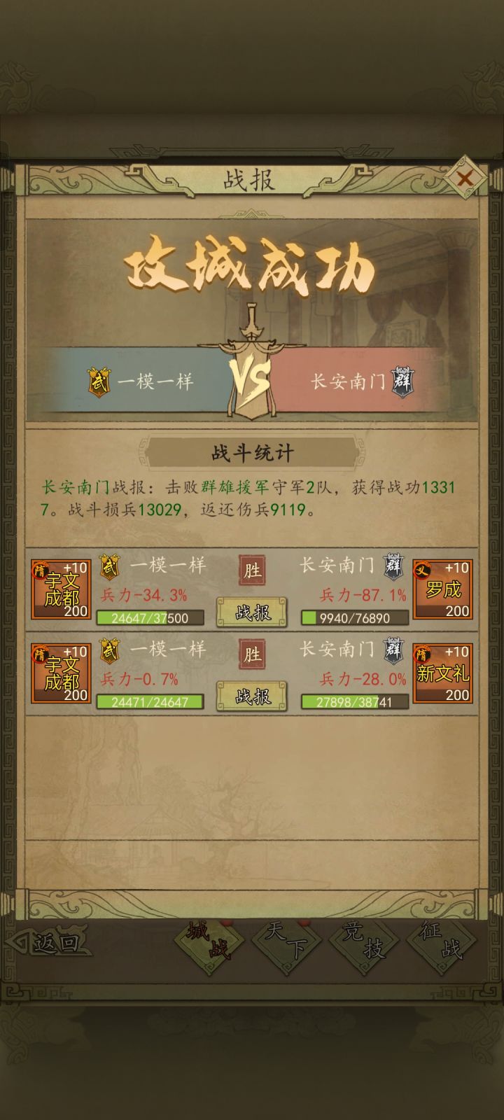 长安战中,每隔20分钟出现的群雄援军的机制发生了变化。原来的群雄援军不会驻守,只会攻占已经有主的城门。而现在会攻占城门后就地驻守,以后就没必要点加速去抢城门了。长安的群雄援军为15w,实力一般,但数量众多。下面以我们势力一位小伙伴的战报为例。