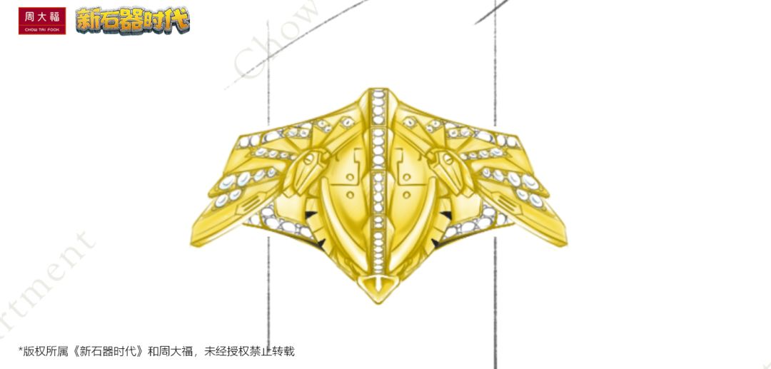 除此之外,为了使戒指更加有立体感,在机械法鲁空翅膀的制作上,周大福向我们提出了使用錾刻、珠化、金筐宝钿等精湛的经典传统制作工艺,让戒指展现得更加立体,并且还在戒身上加入了镶嵌天然真钻的设计,进一步提升戒指的整体质感,使得戒指整体变得更加丰富。