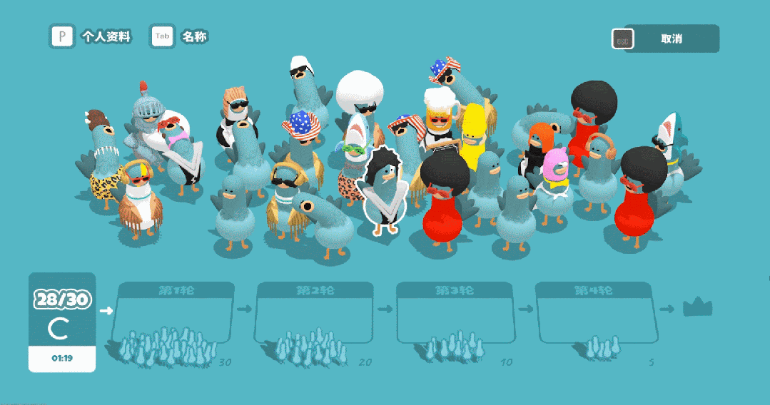 和正常音游比,《节奏天鸽》并不能选择关卡游玩,而是像《糖豆人》,那样,点开始后会给你先匹配29个同台竞技的对手,再从30个玩法中随机抽出4个玩法进行四轮游戏,每轮都会淘汰掉一批人,最终决出谁才是真正的节奏天王。