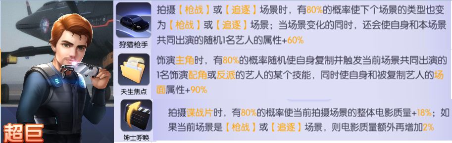 1技能场变,是目前10个超巨当中唯二场变的技能,另外一个是阿汤哥。发动的时候会使下个场景也变成枪战,当然,质量也是一同改变的,而且会使在场出演的所有西洋艺人提升场面属性,注意:是所有西洋,更包括了自己。(适用性毋庸置疑,当前1-5赛季的版本之神技,想想看,配合奥托2技能再次释放,配合约瑟夫1技能复制一下会是什么结果?本人深有体会)