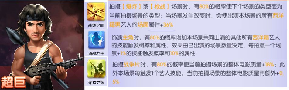 2技能饰演主角时,随机复制一名出演的配角或者反派的一个技能,同时增加自己和对方的场面属性,5级加450%(看到这两个技能,和加斯形成强烈的对比,弟弟始终是个弟弟,所以他只能是T0,不能捅破天花板。)