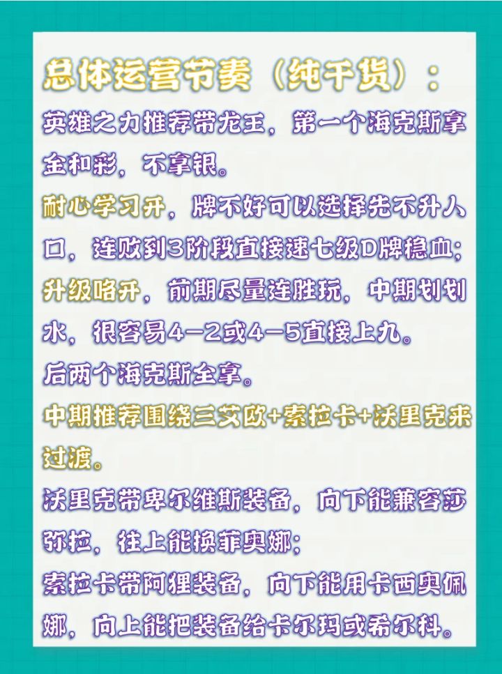 耐心学习开,牌不好可以选择先不升人口,连败到3阶段直接速七级D牌稳血;升级咯开,前期尽量连胜玩,中期划划水,很容易4-2或4-5直接上九。