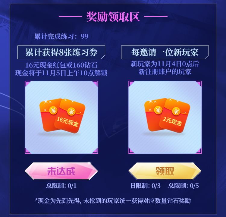 累计获得8张练习券可得16元现金,每邀请一位新玩家还可领取2元现金(16元现金奖励将于11月5日10:00开放领取;新注册账号的新玩家需为11月4日0点之后注册,邀请新注册账号的新玩家的奖励单日限制领取3次,总限制领取4次)~