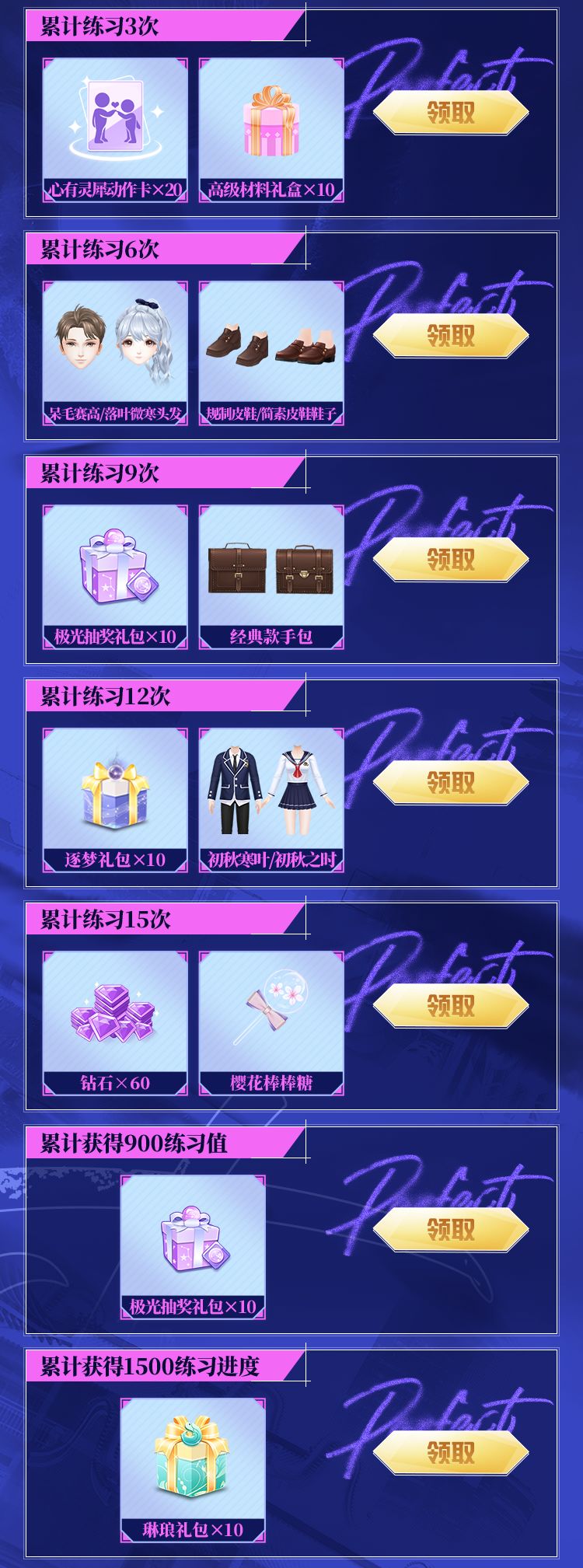 11月4日至11月17日期间,玩家通过邀请练习官助力/完成页面任务获得练习券/练习机会(符合练习官身份条件为:2023年11月4日0点后新注册账户的玩家或2023.10.28-2023.11.3未登录游戏的玩家),消耗练习机会开始不同的练习获得练习值(使用练习券可直接完成当次练习且不会消耗练习机会,具体规则请以活动页面为准),达到指定要求可领取钻石*60、呆毛赛高/落叶微寒头发、规制皮鞋/简素皮鞋鞋子、经典款手包、初秋赛叶/初秋之时、樱花棒棒糖等奖励。