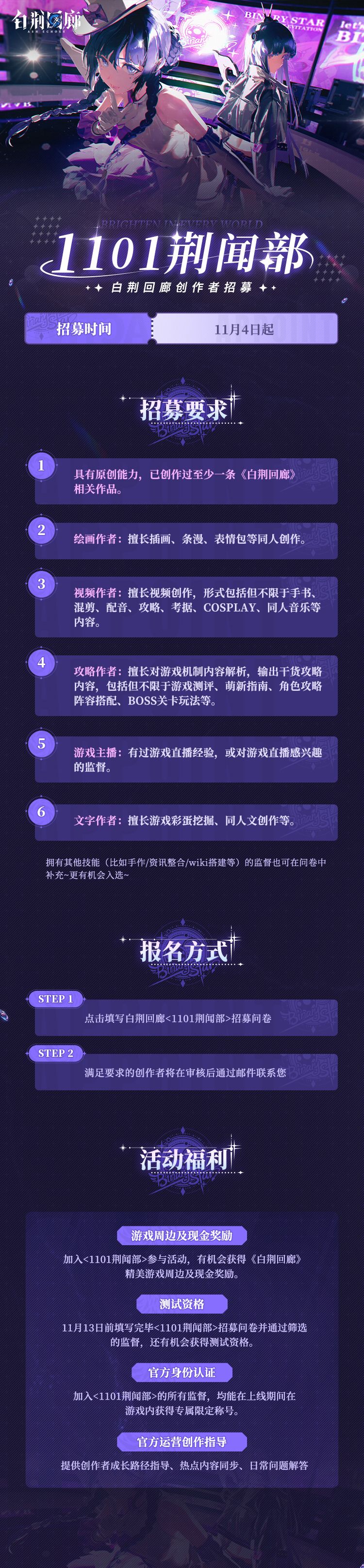 加入「1101荆闻部」参与活动,有机会获得《白荆回廊》精美游戏周边及现金奖励。