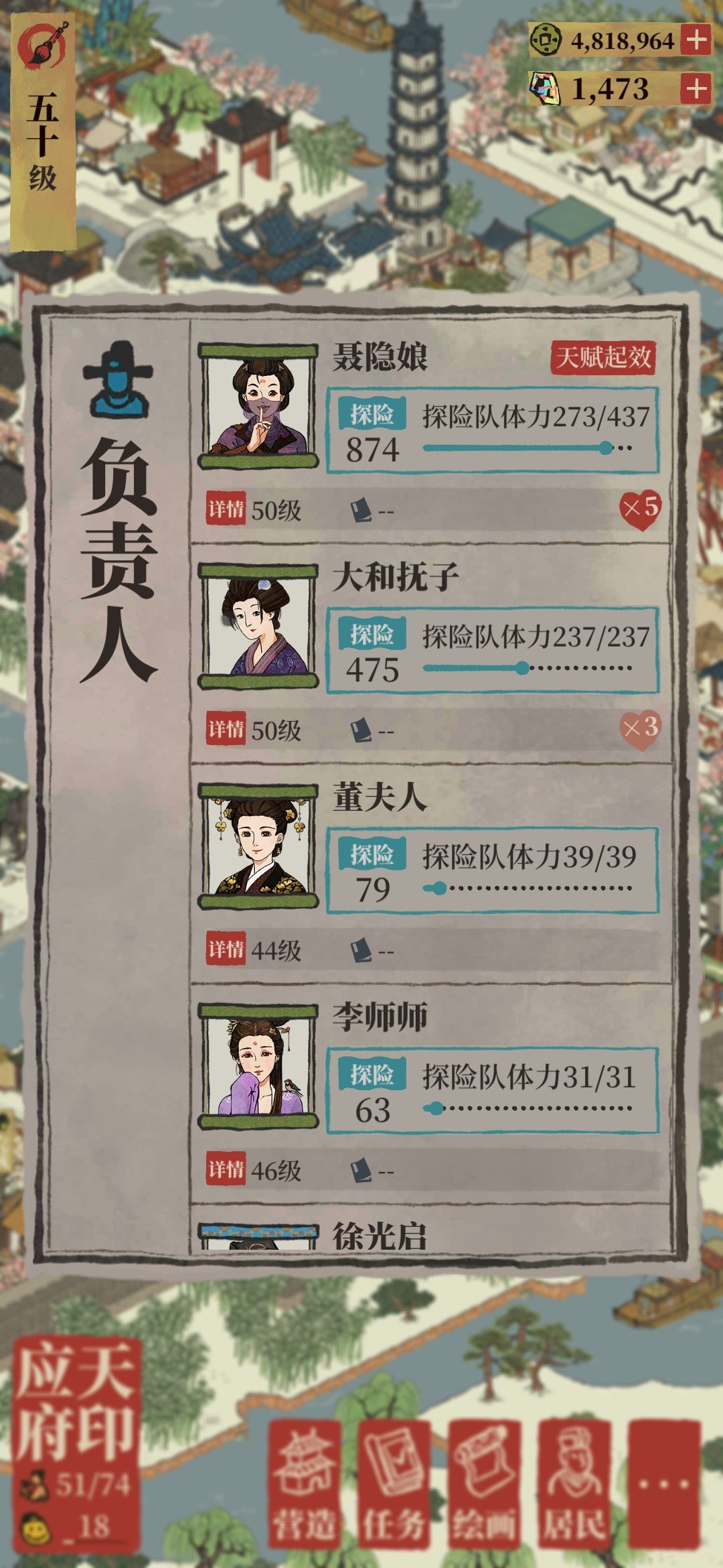 ②给特殊人物带上探险属性珍宝。这里是为什么我开头提了一句驿站。我想肯定很多人以为换了探险珍宝,本来300+的体力就变成了500+了吧,错了。我开始也想着就一两个满级风火轮怎么都够了吧,结果我试着把风火轮从满级徐霞客身上戴到和尚那里,徐霞客的体力马上就变成了385再给他戴上风火轮,他又得重新恢复体力。我试了好几个人都是这样,而我将小于原探险数值珍宝放到大和抚子身上时,她从255→237,如图p2p3。