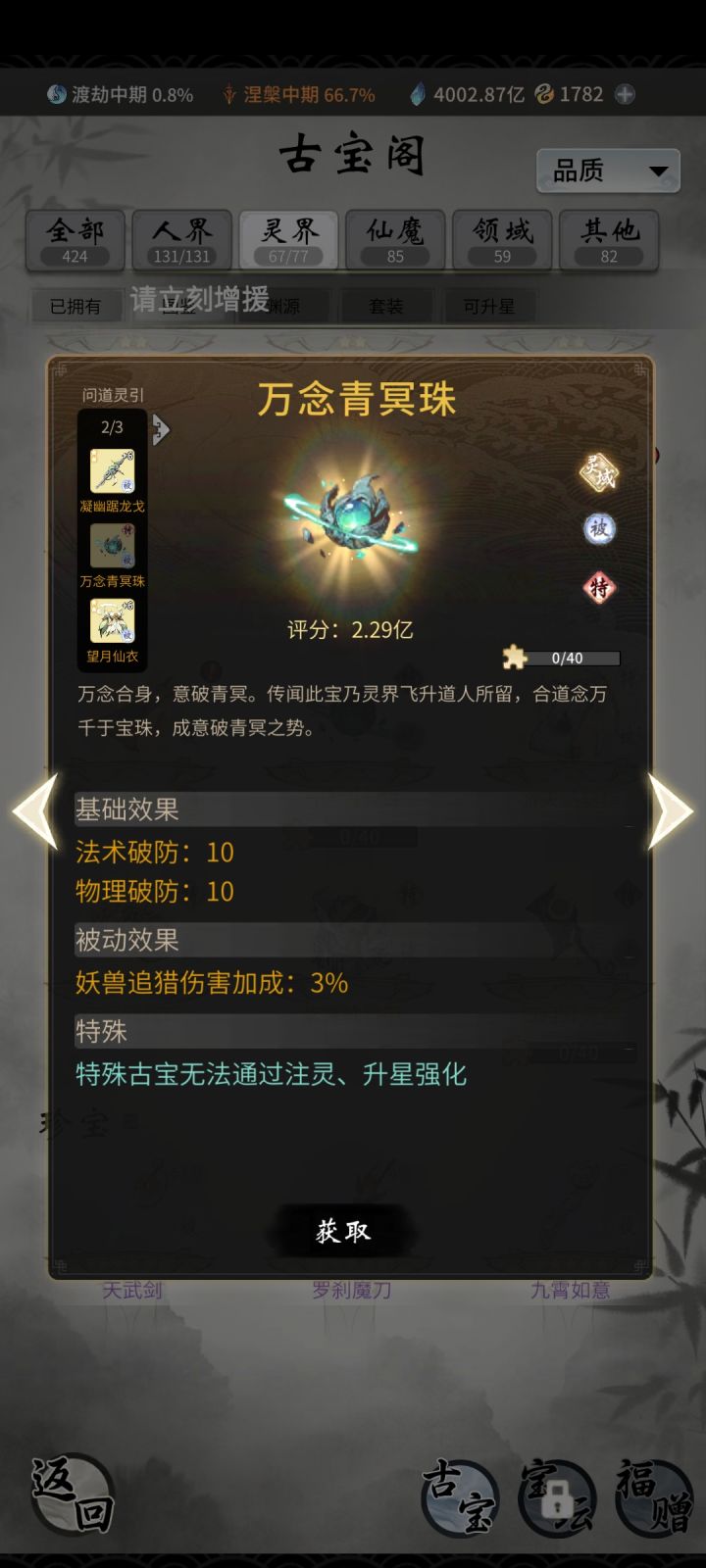 万念青冥珠在哪里搞,搞不到拿不到山海经,灵界古宝里抽不到。。。灵界自选里也没