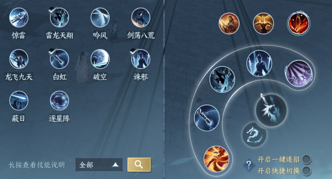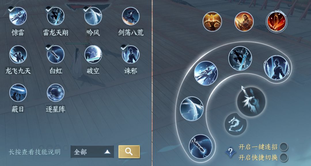 2.重剑一键连招龙吟。近战龙吟,比起手搓惊雷没那么帅,不过简单很多,注意躲技能就好,比血河的优点是不用站桩打刺刺挑。玩法:切换重剑,带上荡剑八荒放一下,然后把荡剑八荒换下去,就切换成重剑形态了,打铁打满,三剑起手,诛邪收回,绝技一放,开始一键连招即可,丹心饮意好了按一下。