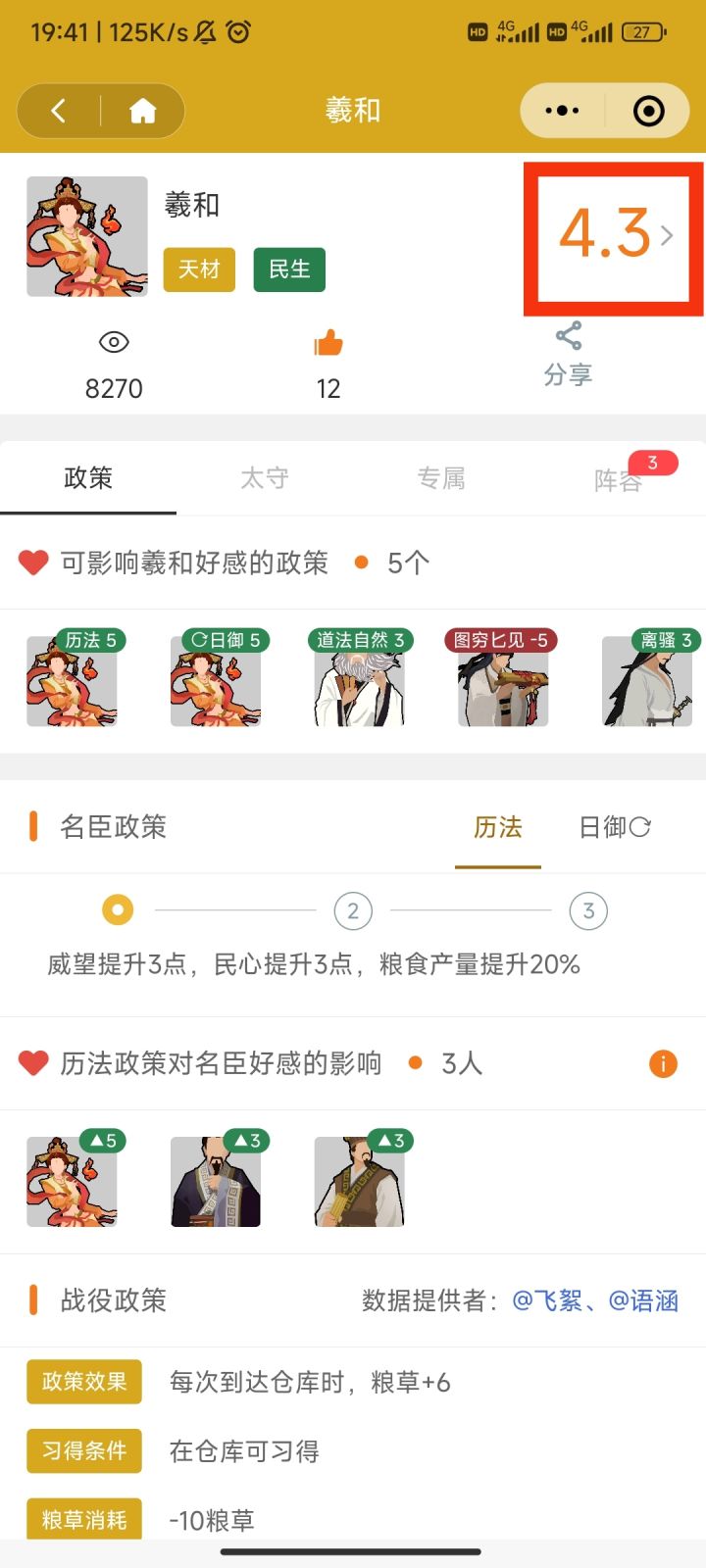 3.名臣强度排行榜:小程序会根据所有玩家提交的分数实时计算出名臣平均分,给出所有名臣强度评分排行榜。