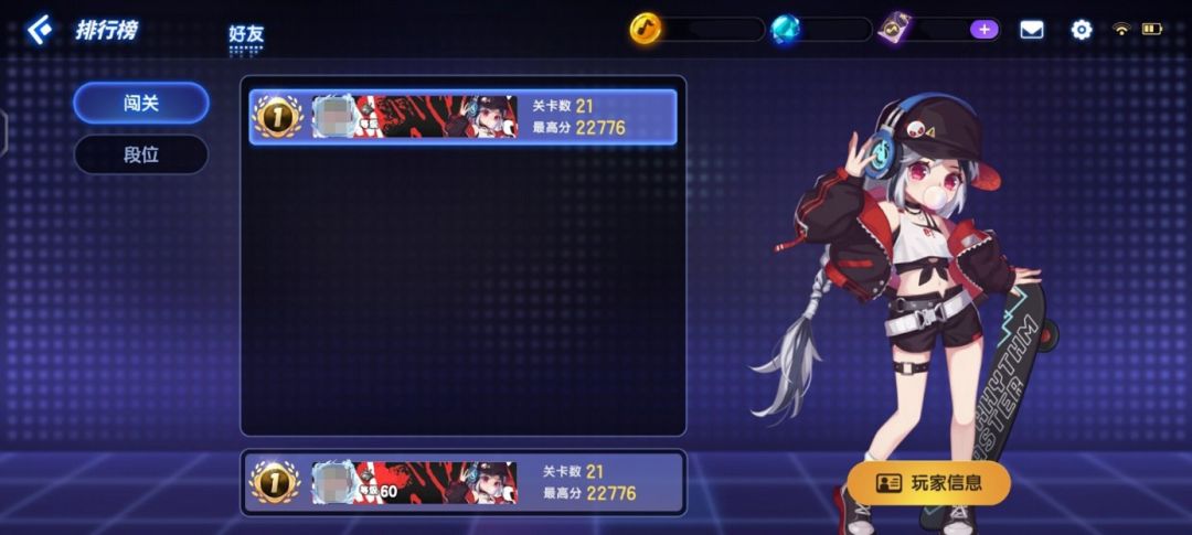 在全新的排行榜界面,演奏家们可以清晰的看到好友之间的排名&段位以及当前关卡数,并且也可以看到好友当前通关关卡的最高分数。