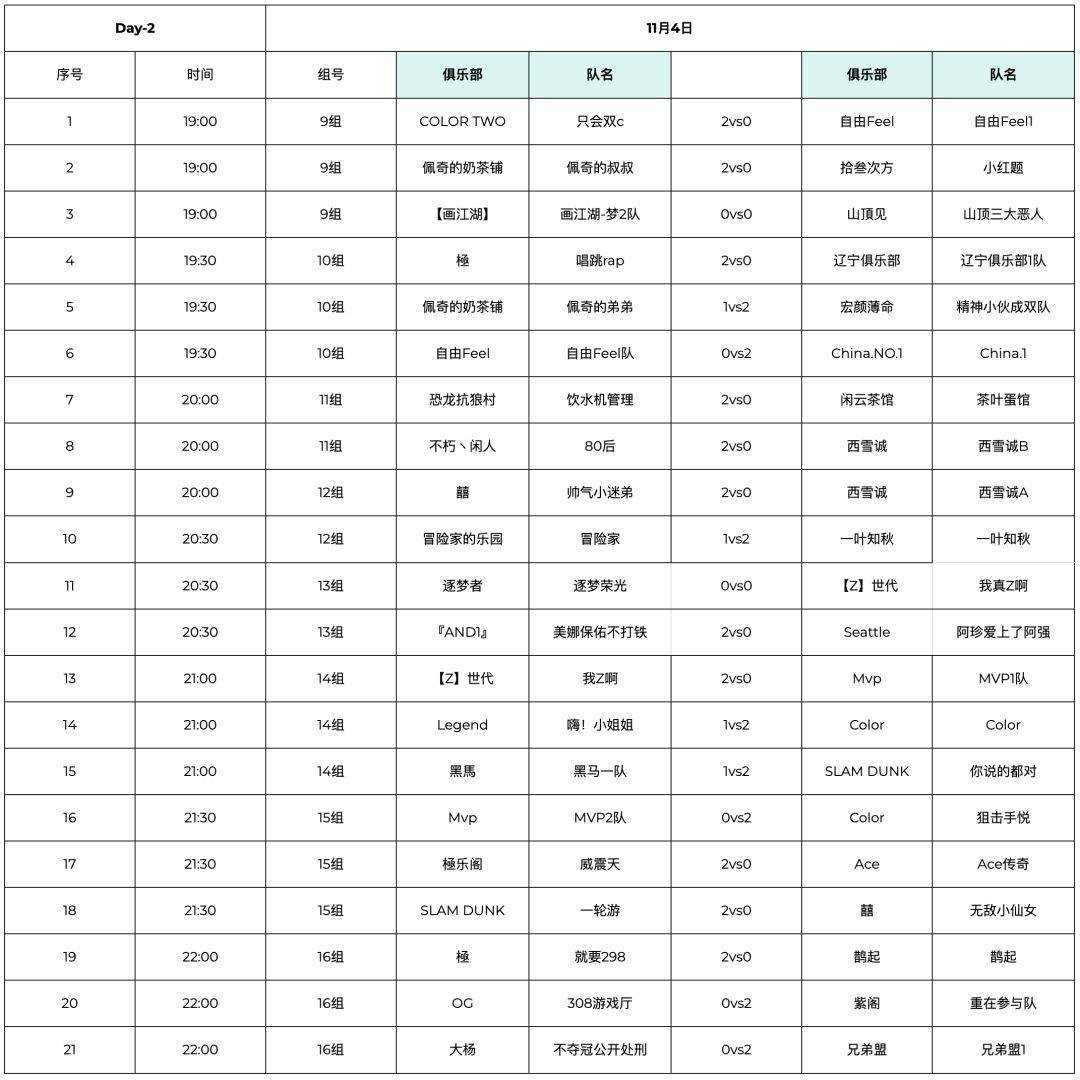11月4日(周六),第一届街球艺术大师赛第二个赛日进行了9~16组的对战,所有结果显示如下: