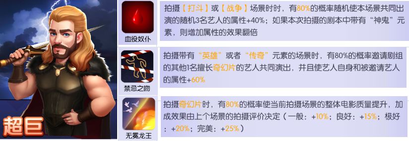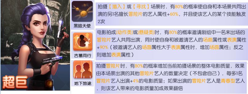 2技能,拍成动作或者悬疑,80概率邀请一位没出演的冒险艺人出演,同时加自己和被邀请艺人的单属性,5级是450%,至于加表演还是场面就看被邀请人的属性了哪个高了,场面高就加场面,反之表演。