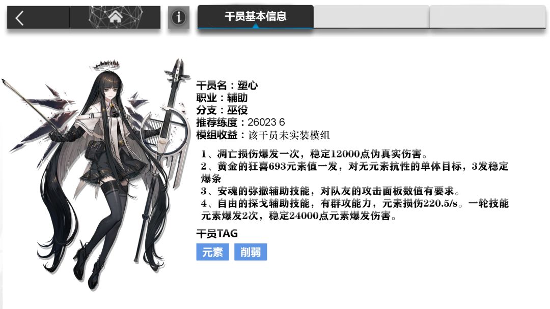 D、当前版本并未实装加成元素损伤的收藏品,凋亡损伤体系输出上限一般,塑心在输出端只能承担补输出的任务,不能作为核心,塑心开局对输出干员的需求也是很高的。