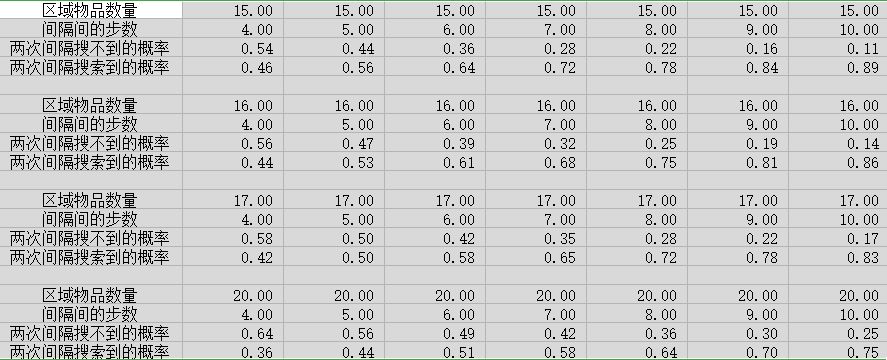 (你问我为什么不把计算公式放上去,一是因为计算公式很简单二是我放了你真的会看吗23333).我们可以看到,当我们一步一刷新的时候即使经过了三次刷新,我们得到物品的概率非常的低1/4都没有哦。当我们放缓刷新的频率后可以在12-15步高概率的得到我们想要的物品。喜欢少量多次的同学要记得改正自己的习惯哦。(其实这个结论有些不太严谨,因为步数是发生了改变的,但在区域物品12时走12步,每一步都刷新一次得到物品的概率为0.45还是低于0.70这个值的。)